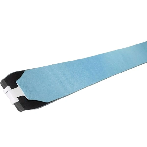 De 100 mm brede voorgesp, met de huid over de rand gevouwen, past op de meeste tips, en de in lengte verstelbare hielclip past ook op ski’s met dubbele tip.