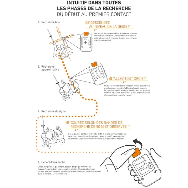 Deze intuïtieve en compacte lawineontvanger met drie antennes geeft duidelijke gesproken commando’s die aangeven wat te doen in elke fase van de zoektocht en u kalm houden wanneer het overleven van een partner op het spel staat. De stabiele weergave vanaf de eerste ontvangst vermindert de stress in geval van nood en maakt een snellere zoekactie mogelijk. Bovendien is dit toestel uitgerust met de gepatenteerde Smart Antenne-technologie, die de positie van het toestel in de lawine analyseert en automatisch overschakelt op de beste zendantenne. Dit geeft tot twee keer het bereik en maakt het mogelijk om sneller gevonden te worden. Anderzijds heeft het een eenvoudig en logisch ontwerp, waardoor het bijzonder gemakkelijk en intuïtief te gebruiken is, want met één enkele knop kunt u snel slachtoffers markeren of overschakelen op de stand-by modus, terwijl de automatische overschakeling van de zoek- en stand-by modus naar de zendmodus in geval van een over-avalanche de totale bescherming van de zoeker garandeert. Het grote, volledig grafische display blijft zelfs in extreme lichtomstandigheden goed afleesbaar en leidt de gebruiker intuïtief door stresssituaties met duidelijke instructies en een 360° real-time weergave.